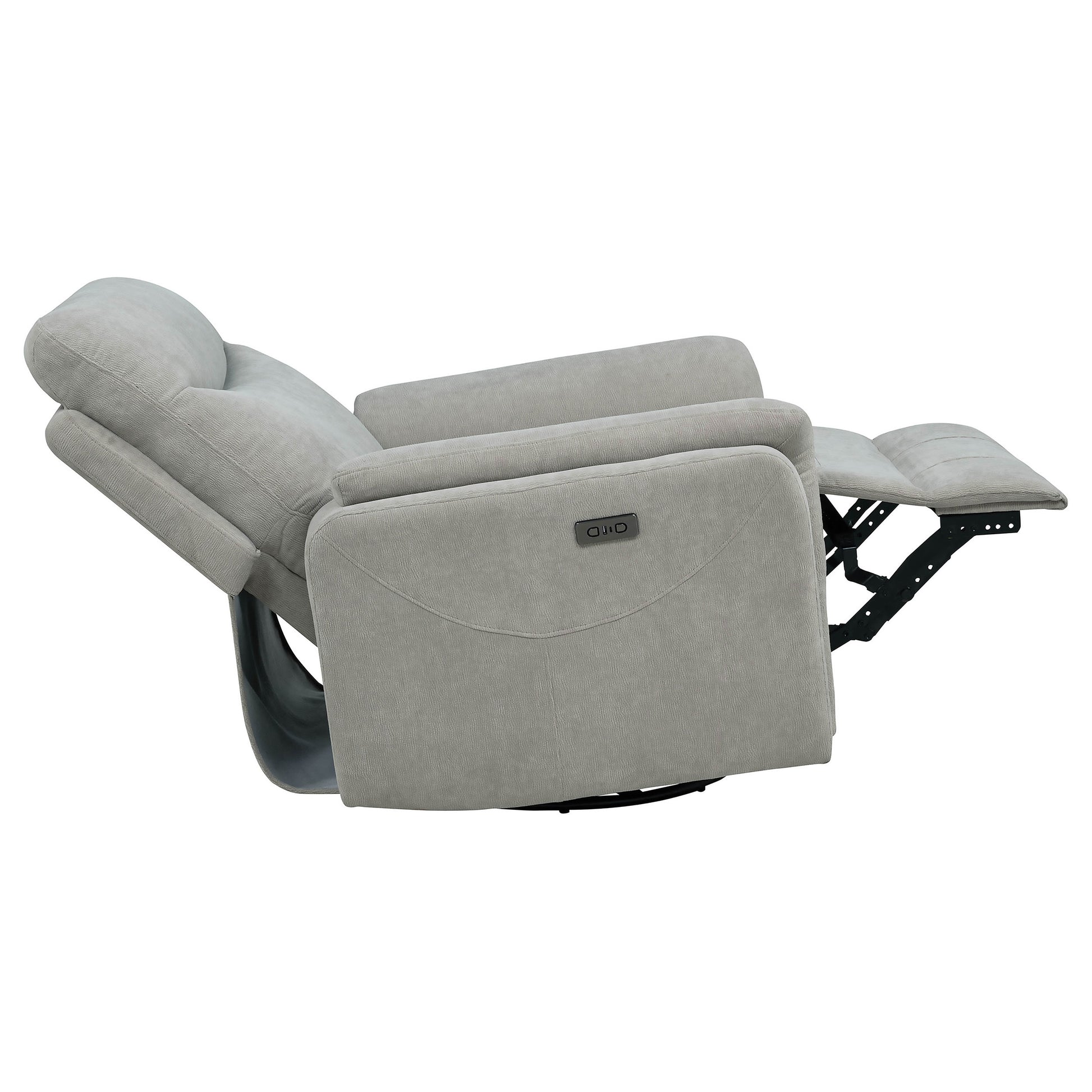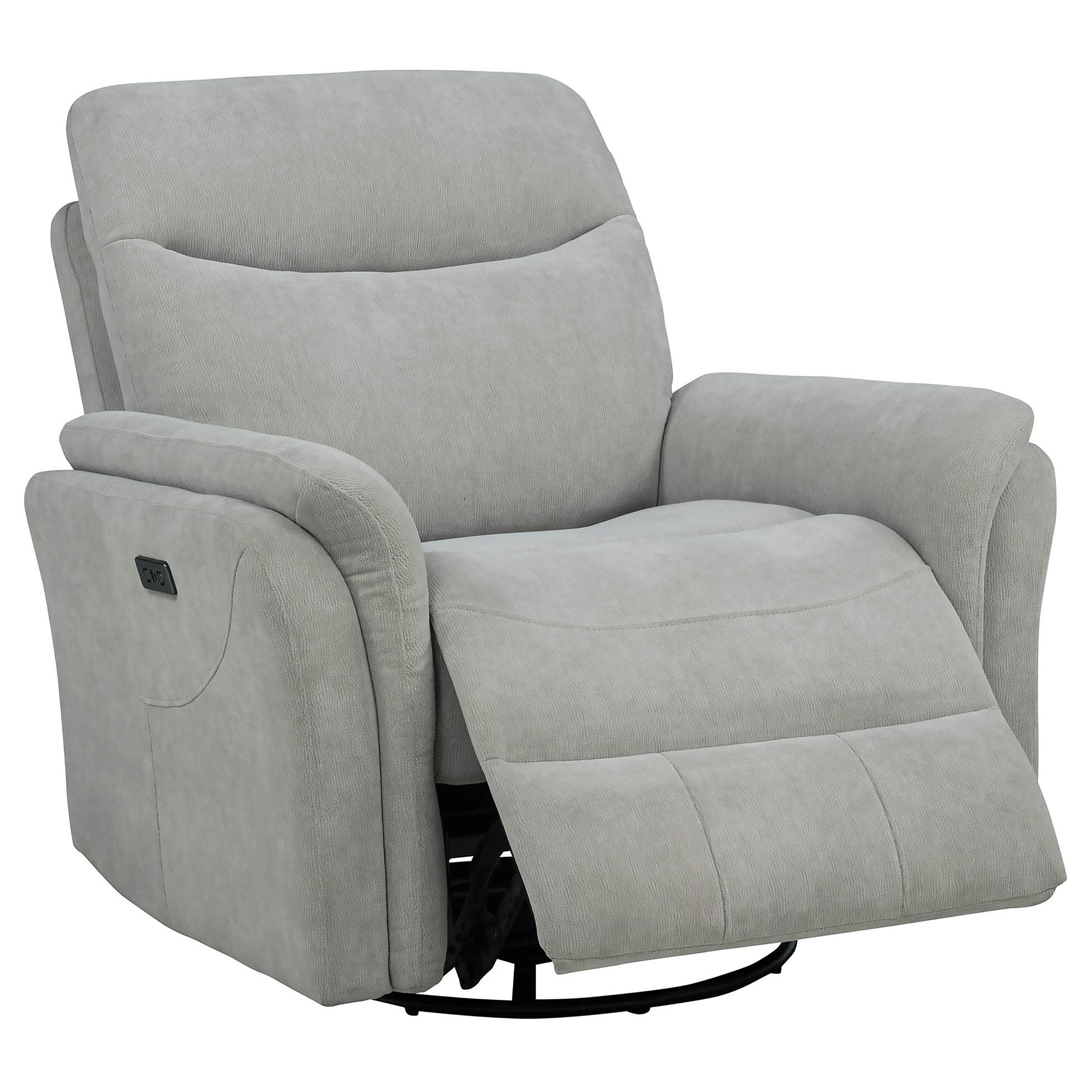 Relaxation meets innovation in this power swivel glider recliner, designed for effortless comfort. A smooth power recline mechanism lets you find your perfect position, while a built-in control panel with USB-A and USB-C charging keeps devices powered within reach. Upholstered in soft fabric over plush foam cushioning, it features gentle gliding and 360-degree swivel motion for versatile lounging. Ideal for modern living rooms, nurseries, or reading corners.