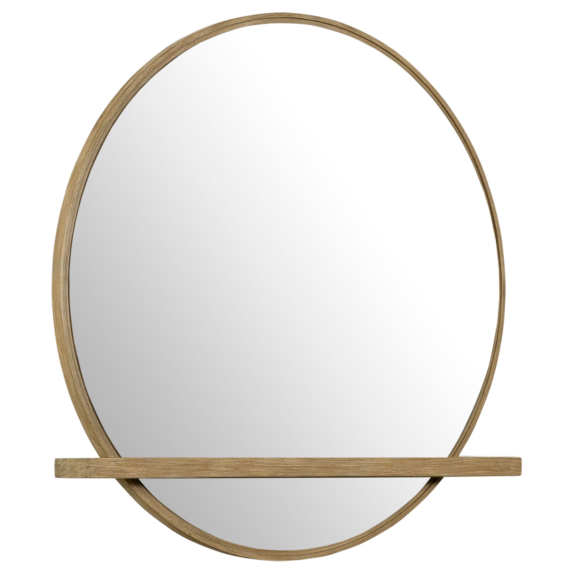 Create a relaxing atmosphere with the clean lines and neutral, wire-brushed, sand wash finish of this coastal bedroom set. A grey fabric padded headrest and footrest along with aged brass hardware throughout each piece offer lovely modern glam accents. Matching storage pieces and round framed mirror complete the set, offering thoughtful touches like felt-lined top drawers and a built-in tray.