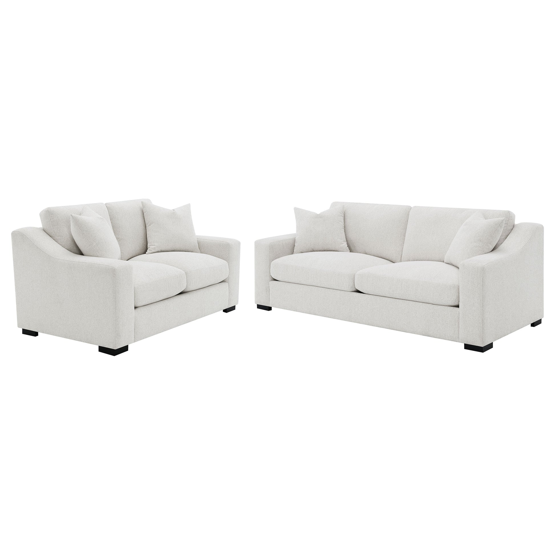 This sophisticated sofa set blends sculptural curves with plush, supportive comfort. Curved track arms define each silhouette, while reversible cushions filled with down-like fiber and supported by pocket coils ensure softness and structure. A sinuous spring deck rests over a solid wood frame for enduring durability. Wrapped in textured fabric upholstery, each piece includes accent pillows that elevate the lounging experience with cozy elegance.