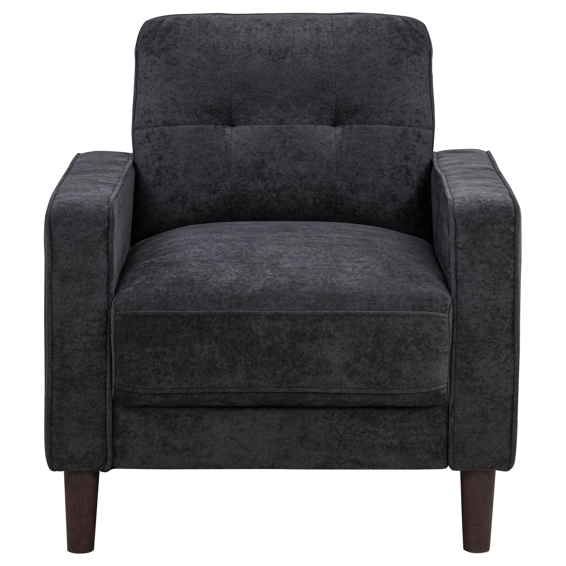 This modern accent chair brings cozy scale and crisp structure to any compact space. Wrapped in soft, textured upholstery, it features slim track arms with cord welt trim and a grid-tufted back for tailored charm. A pocket coil seat offers long-lasting comfort, while tapered round legs provide a stable, elevated base. Perfectly sized for apartments, bedrooms, or reading nooks, this chair delivers a refined yet inviting presence.