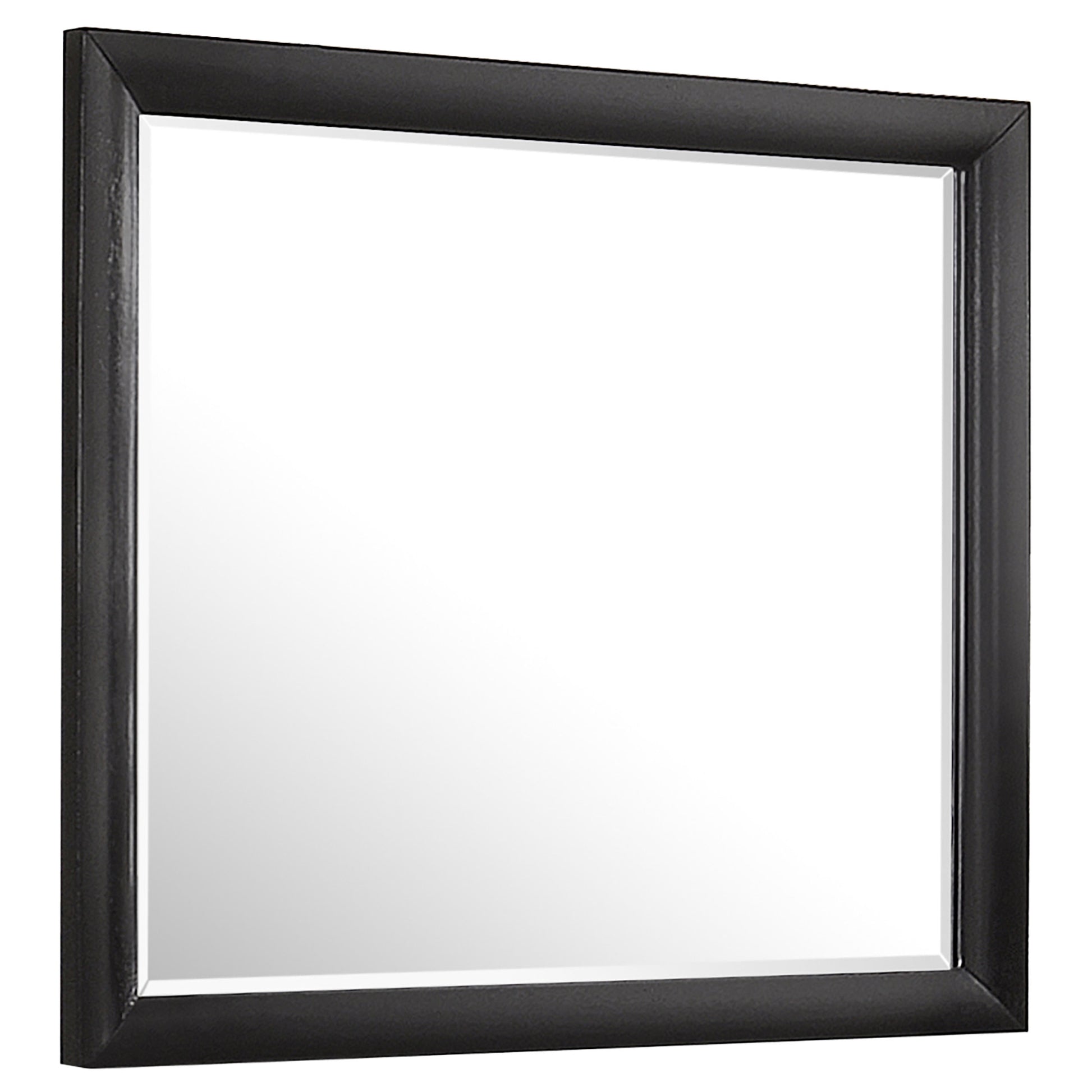 Expand the sense of space in your bedroom with this elegantly framed mirror. Designed in a sleek black finish, it features clean lines and subtle beveled edges that bring refined depth and dimension to any wall or dresser surface. The rectangular frame pairs beautifully with matching furniture pieces, offering a cohesive look across the room. Crafted from durable rubberwood and okume veneer, this transitional mirror combines strength, simplicity, and timeless design for lasting everyday use.