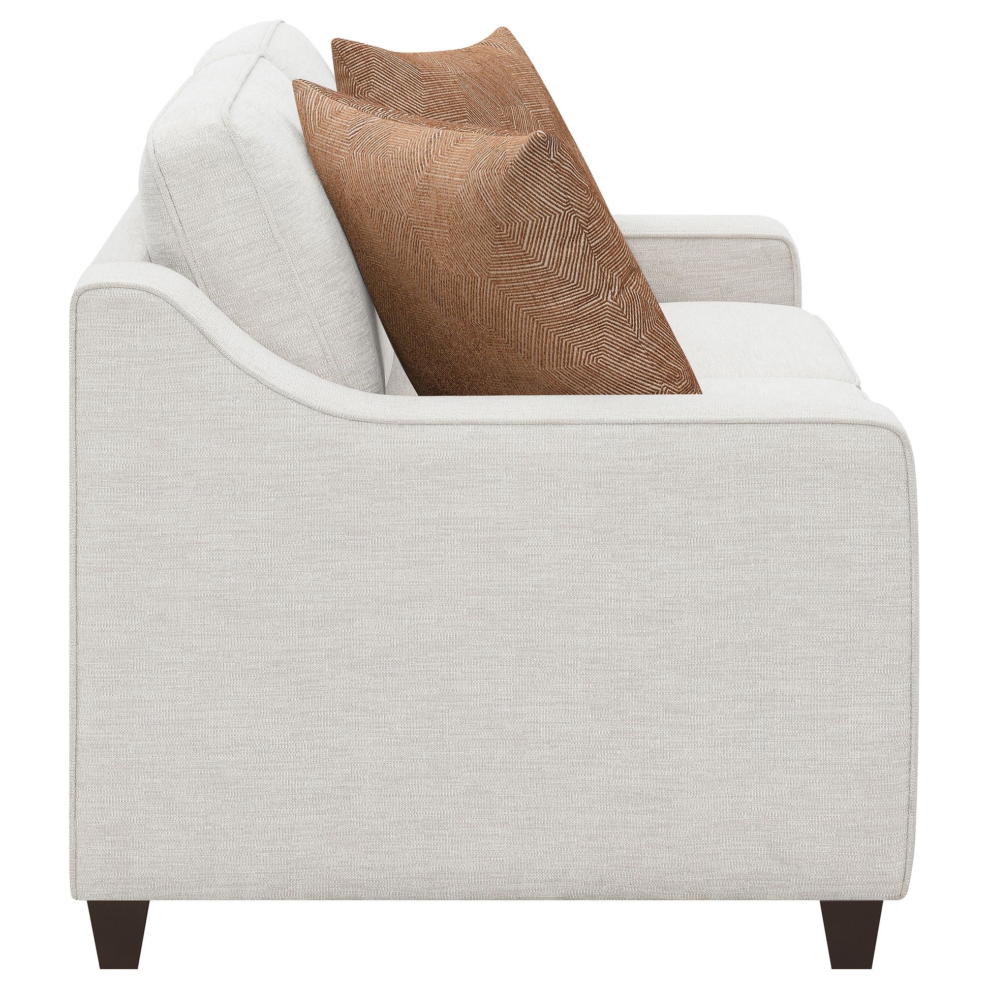 Wrapped in a cheerful, beige woven chenille upholstery, this seating set exudes a look of sophistication. Sloped track arms add elegant lines while tapered dark brown legs add a striking contrast. Understated yet regal, this transitional seating set works inside farmhouse and contemporary style homes effortlessly. Dense and plush boxed seat and back cushions feature classic welt details, as coral and copper tone accent pillows lend a boho-like tough. Add this upholstered furniture set into a space for a subtle chic aesthetic.