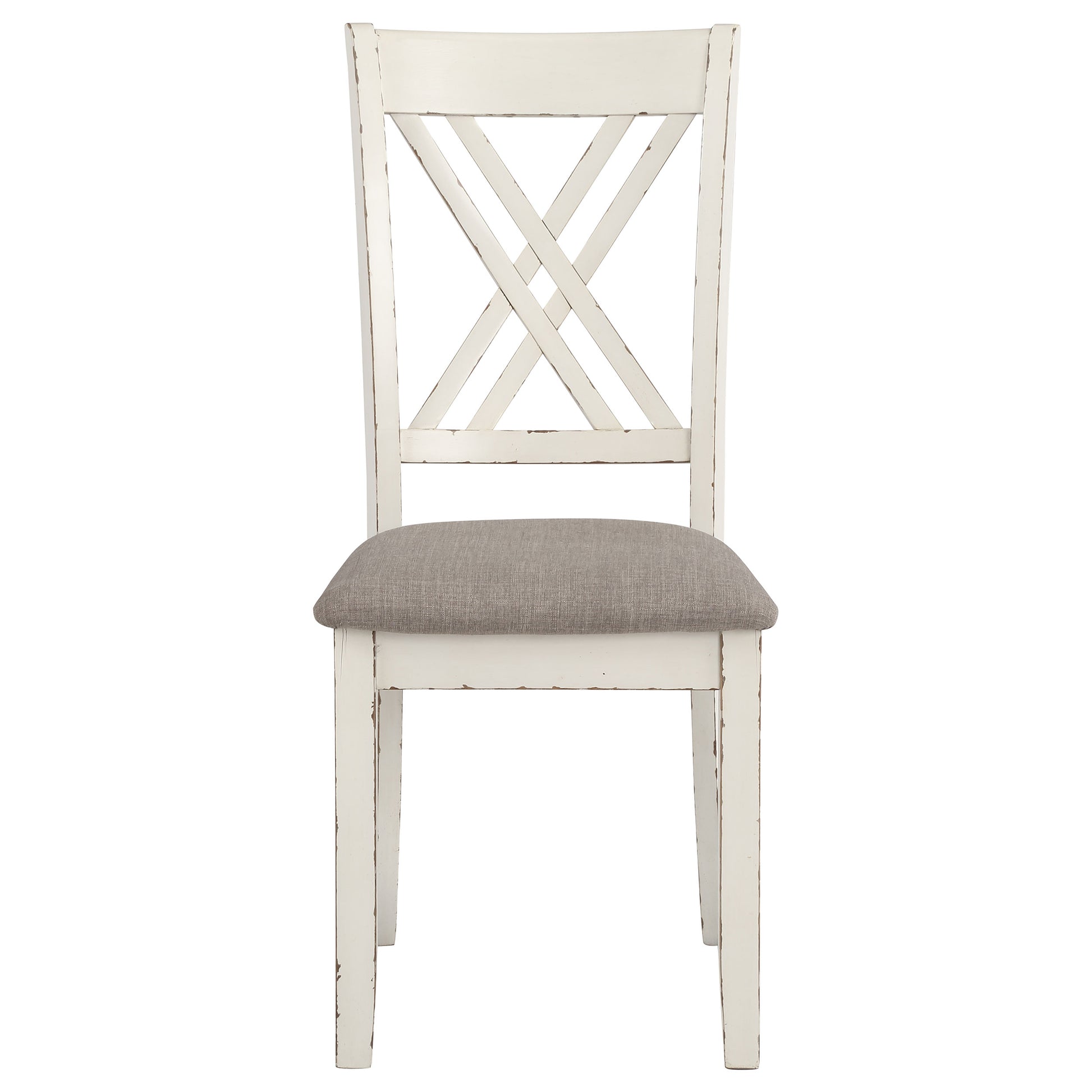 Complete your modern farmhouse dining room with this seven-piece dining set. Complete with one dining table and six side chairs, it offers a matching vintage white finish that lends a country charm. The spacious, rectangular dining table also features a chestnut colored, sandblasted wood tabletop with a dry brushed weathered finish. Each of the six chairs have a sturdy solid wood frame and flared backrests with open double-cross designs. Rest comfortably on their cushioned seats, wrapped in a high performance fabric in a grey hue that complements numerous color palettes.