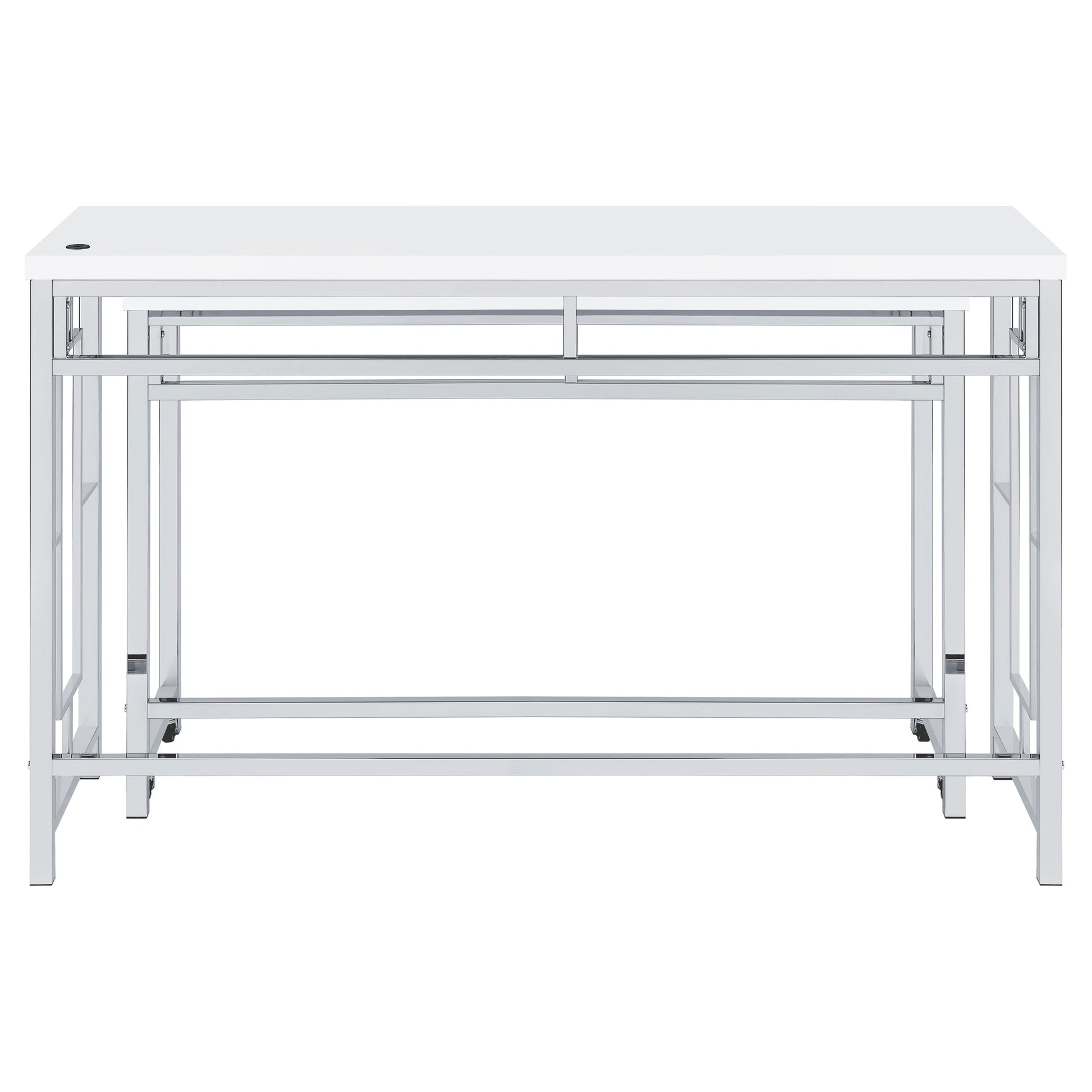 You'll fall in love with the versatility and impeccable styling of a contemporary four-piece counter height dining table set that includes two nesting tables and two backless stools. Whether you're dining or working from home, the set is designed to impress, with a larger table and a smaller table on wheels that tucks underneath, creates a waterfall effect, or can be positioned in an L-shape for working from home. Its crisp white and silver finish combination highlights artistic design. The set is complete with open sides and stool bases accentuated with floating frames to bring Deco character. The large tabletop is equipped with a USB port perfect for your phone.