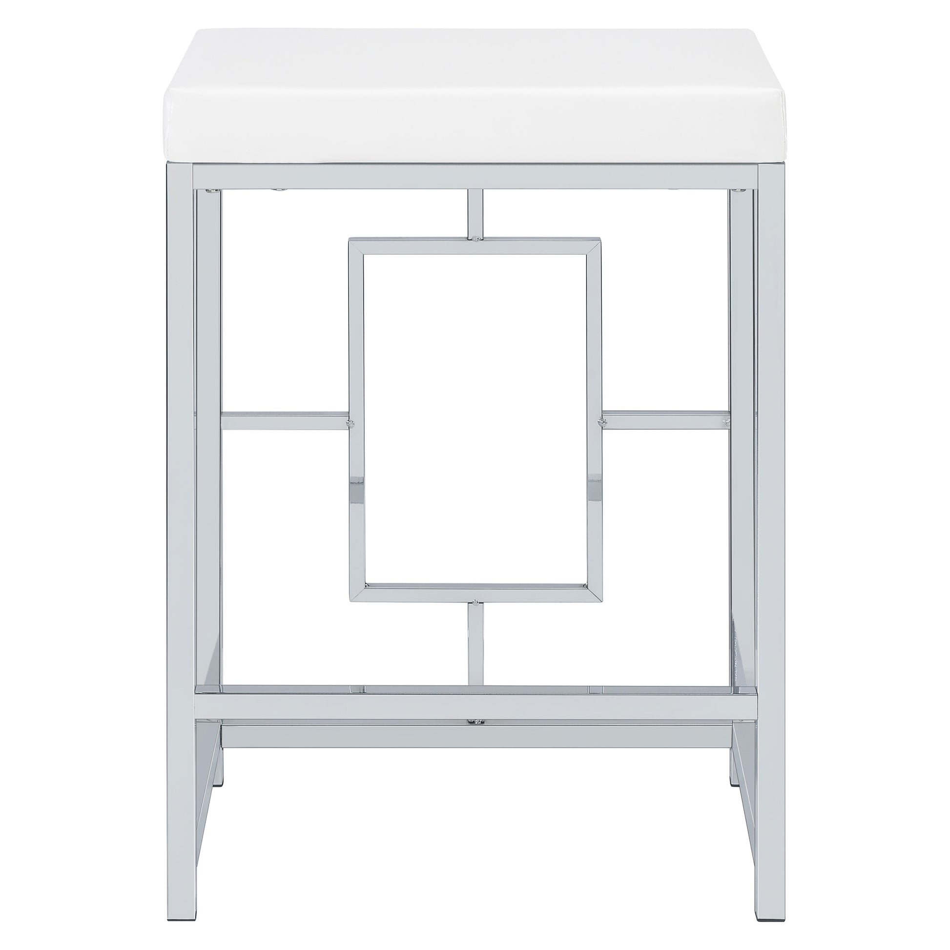 • Two stools are backless, with silver finish bases and faux leather upholstery over foam padding