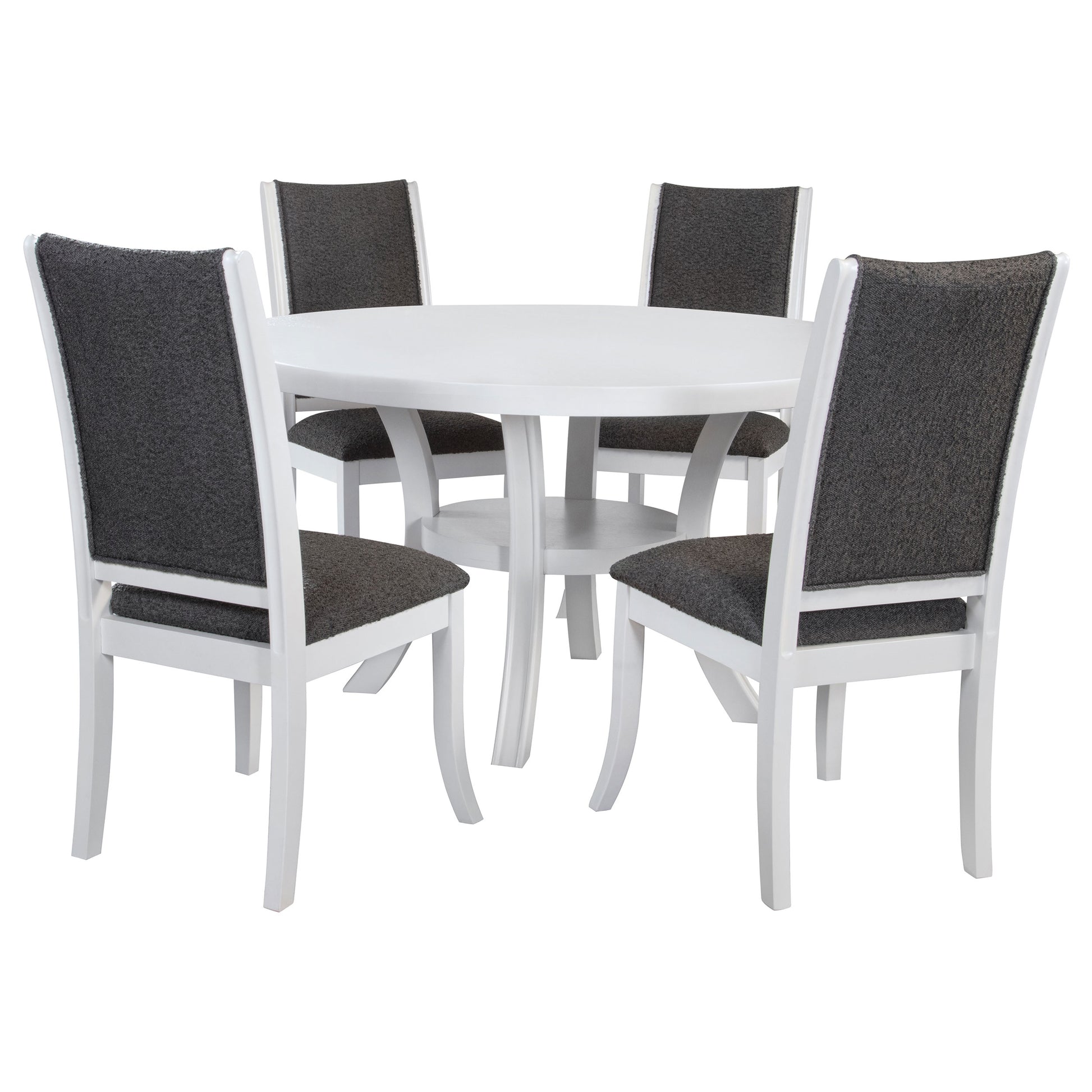 Embrace a modern minimalist presentation with this contemporary dining set. It centers on a roomy round dining table that seats four to six, with flared legs and a round shelf that adds stability and decorative potential. The set adds side chairs, each with a tall, structured silhouette and dark grey upholstery over plush foam cushions. A pearl white finish is clean and fresh, offering plenty of contrast against the grey. The set instills a clean, precise aesthetic, perfect for minimalist or maximalist decor themes.