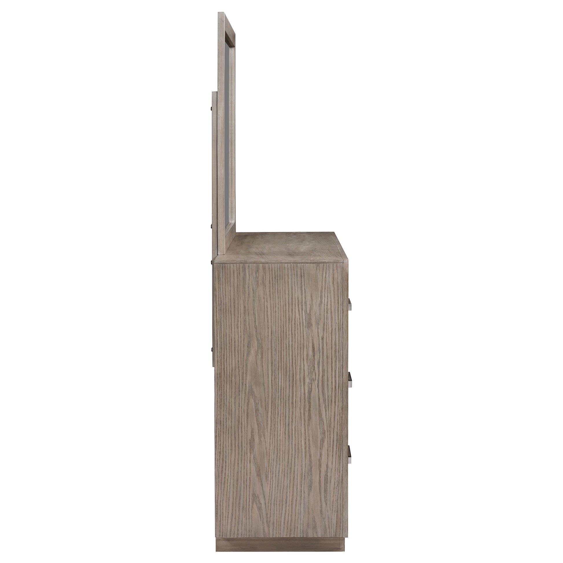 Put a timeless spin on bedroom decor with the refined flair of this modern six-drawer dresser. Designed for neutral appeal that blends into surrounding decor, it features a barley brown wood grain finish. Six drawer fronts are embellished with chrome finish bar pulls for a cohesive look with a touch of texture and depth. The dresser is augmented with a framed mirror on top, creating reflectivity in your bedroom and a spot for styling your daily looks. Add a jewelry box or valet and a bit of decor for a personal touch.