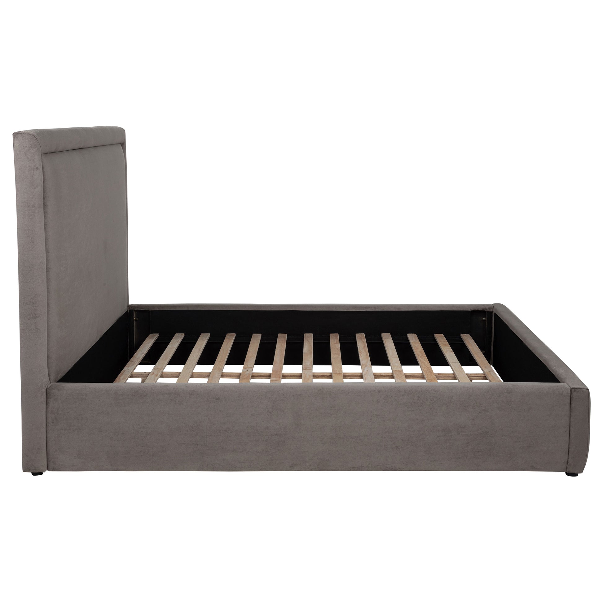 Clean lines and understated elegance define this platform bed, wrapped in smooth upholstery from base to headboard. The simple panel design offers a tailored profile, softened by subtle padding and low foot rails for an inviting finish. With a fully slatted foundation, this bed supports a mattress directly, no box spring needed. Perfect for modern minimalists or transitional spaces, it balances comfort and clarity in a sleek, grounded silhouette.