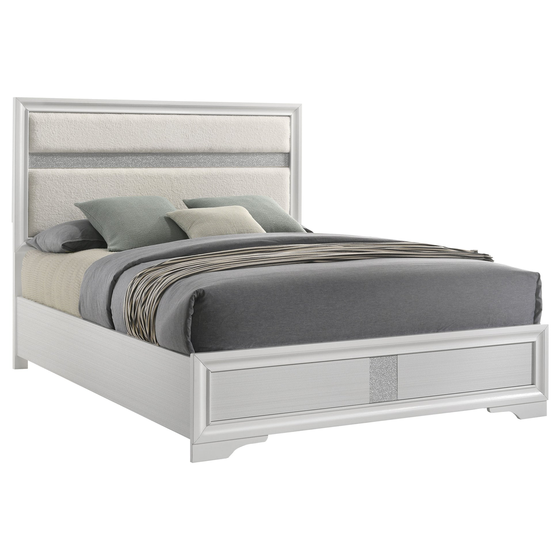 Introduce a little bit of glam flair to your bedroom with a modern upholstered bed. Featuring padded white fabric panels, the headboard is complete with molded trim and a horizontal stripe that glitters in the light. A matching vertical stripe on the low footboard is the perfect complement. A white finish is lightly textured on the panel footboard and rails, while trim is smooth and cool. The bed is complete with slats and center legs for added support and requires a foundation.