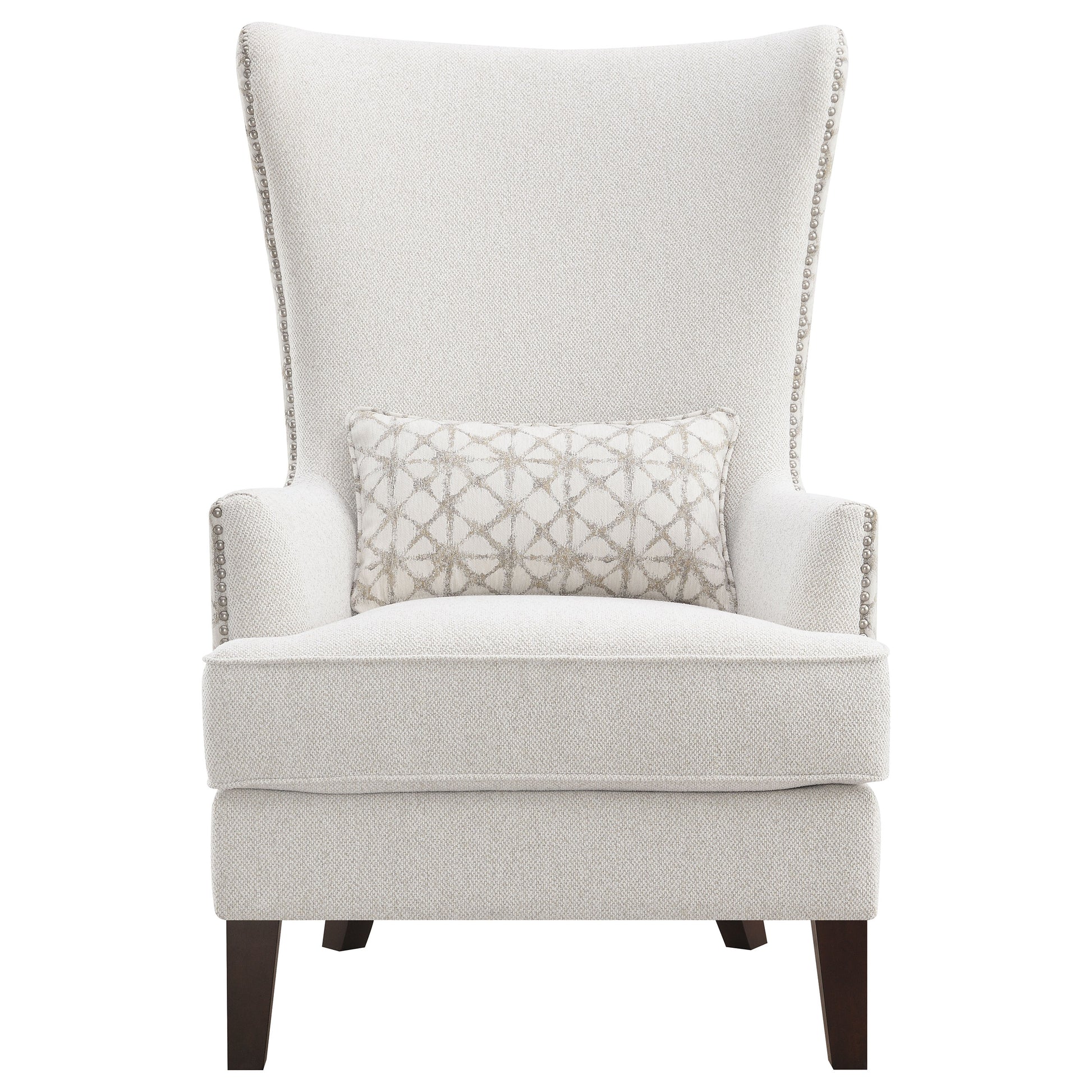 A haven for relaxation, this tasteful accent chair is also a source of inspired beauty, perfect for your semi-formal living area. Sit in supreme comfort on a chair with a frame built of various woods as artisan design elements include an ultra-high wing back with gentle contouring, abbreviated track arms, and a removable T-cushion with polyester filling creating extra support. Geometric patterning accents its gray boucle fabric upholstery in key places, and a welt trim kidney shaped pillow provides extra comfort. Deep brown finish wood legs form curvy silhouetting. Charming silver nail head trim completes a chic package of features for a must-have chair.